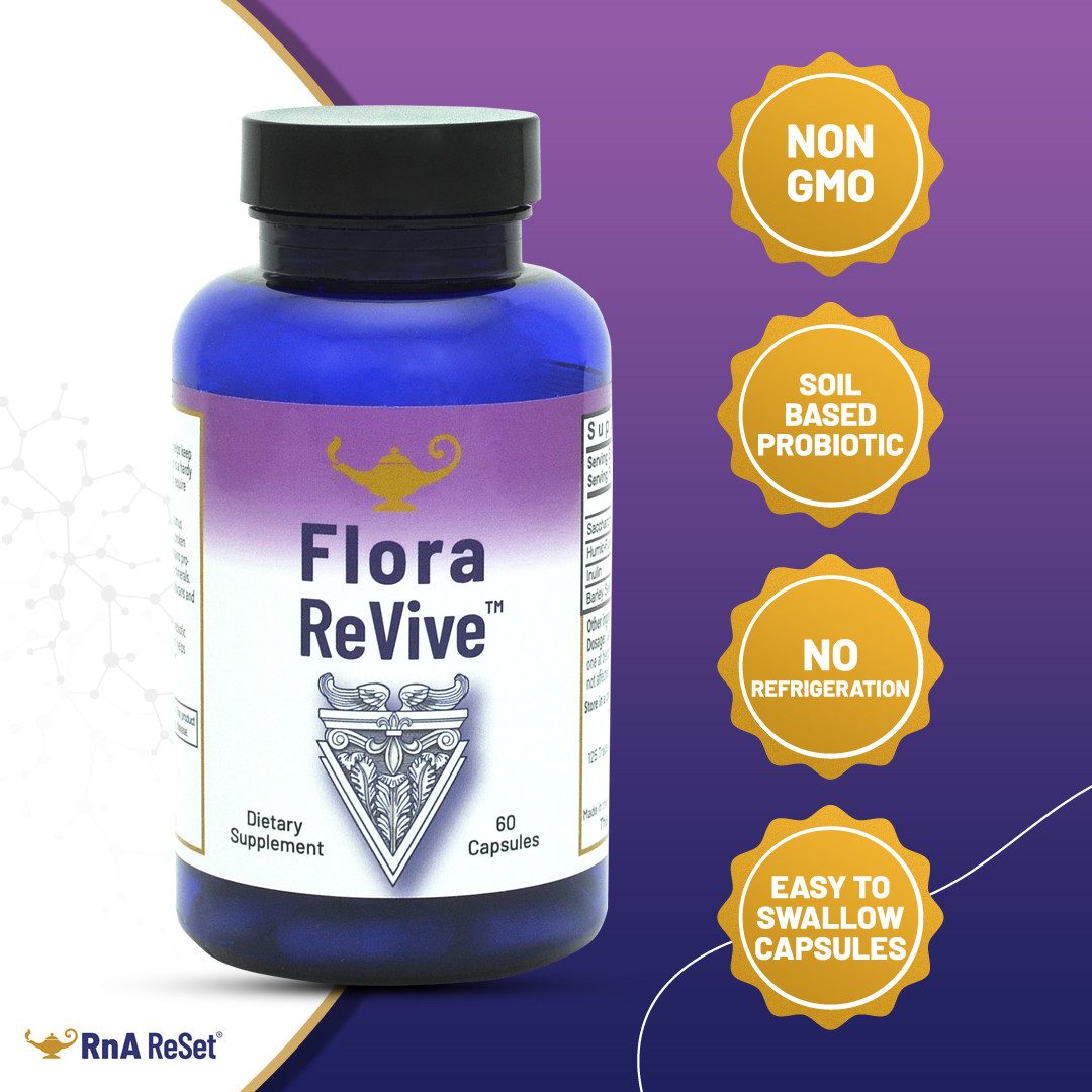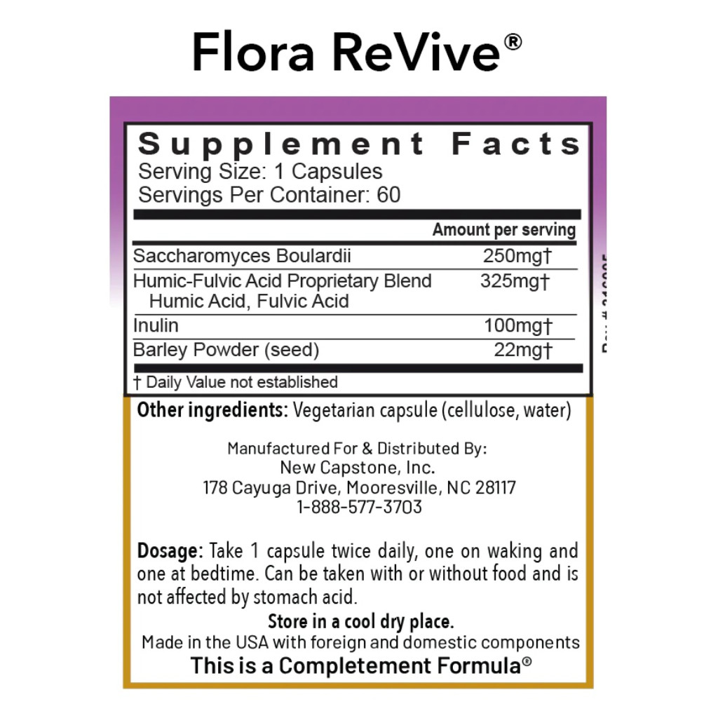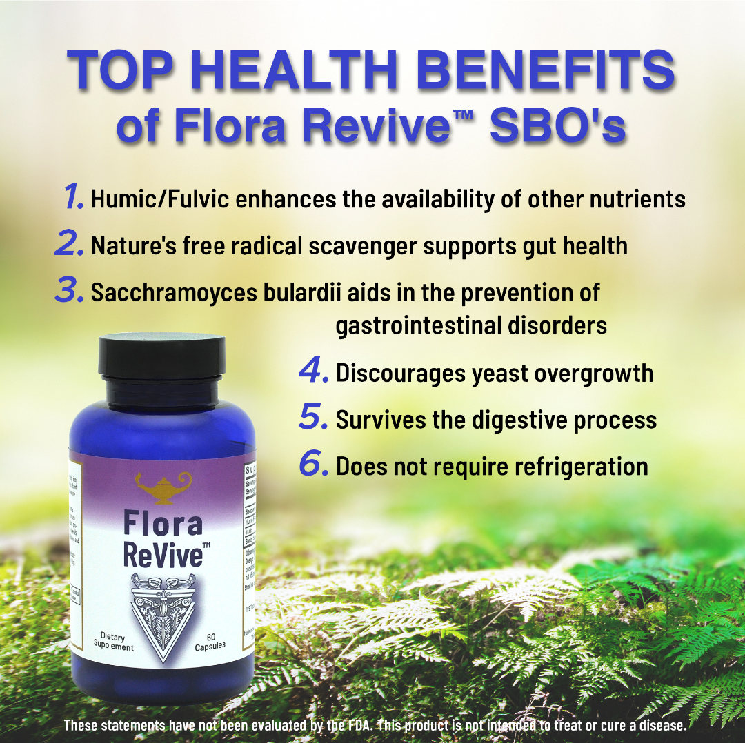 Flora ReVive® je pokročilý probiotický doplněk s výtažky z rašeliny, speciálně vyvinutý pro udržení rovnováhy mezi Candida albicans a prospěšnými střevními bakteriemi. Obsahuje huminovo-fulvovou kyselinu (humáty), které vznikají rozkladem rostlinné hmoty bohaté na uhlík působením půdních bakterií. Humáty jsou považovány za nejúčinnější půdní probiotika – produkty milionů přirozených mikrobů, které dnes ve sterilním prostředí moderního života téměř chybí. Tyto látky poskytují probiotika, prebiotika, fytonutrienty, enzymy i minerály. Díky vysokému obsahu kyslíku působí proti Candida albicans i proti biofilmům.